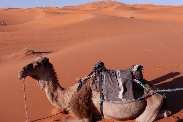 And now comes the magic-mount up your camel and start trekking into the dunes of Erg Chebbi. This will remain a lifetime memory: a moment of tranquillity in the desert under stillness, a golden glow cascading down on the horizon, flaring the lovely golden sands.