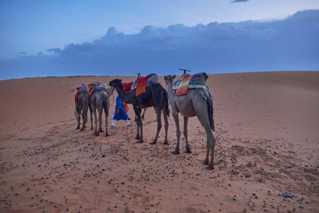 As we drive to the dunes of the Sahara desert, we slowly reach Merzouga in the late afternoon, where your caravan of camels is ready to carry you into the infinite sandy expanse. The sunset is a treat scenic background colors the sand dunes with a golden hue.